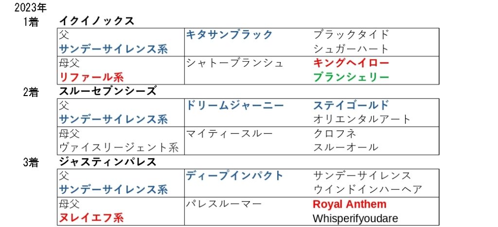 根幹距離のレースほどは勝ち切れていないものの、23年は1〜3着馬がこの産駒でした
