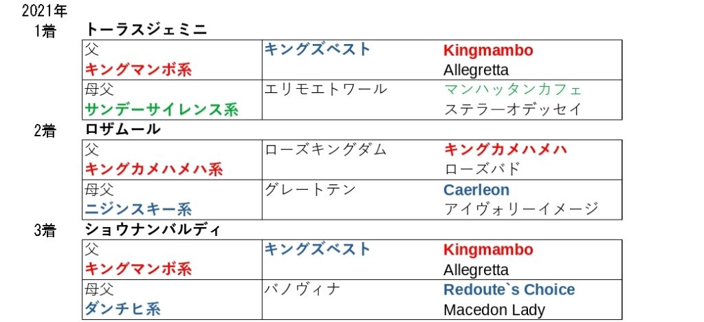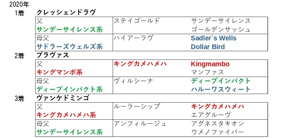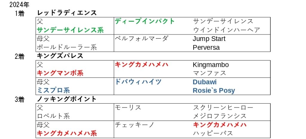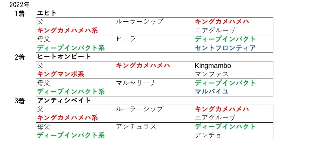 その年によって、ハイペースとなったりスローペースとなっていますが、直線の短い小回りコース、1コーナーまでの距離が十分にあることで、序盤からペースは上がり中盤も極端に緩むことの無いワンペースとなりやすく、後半の仕掛けどころもラスト4F目からとなることから、追走力と後半の持続力、スタミナやを持つこの血統が大活躍しています
