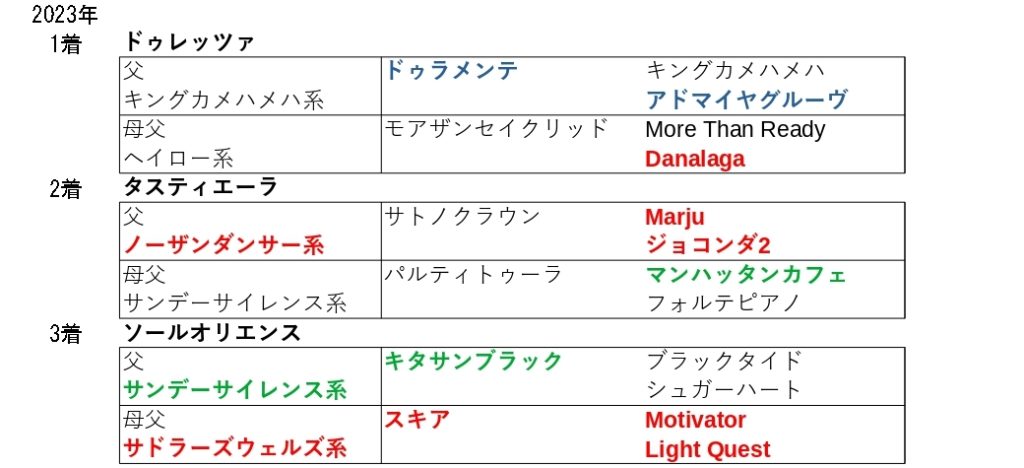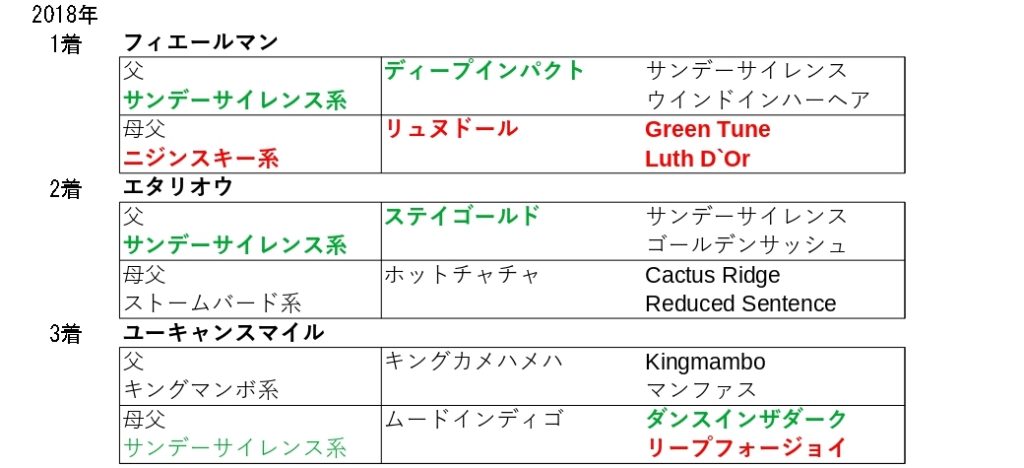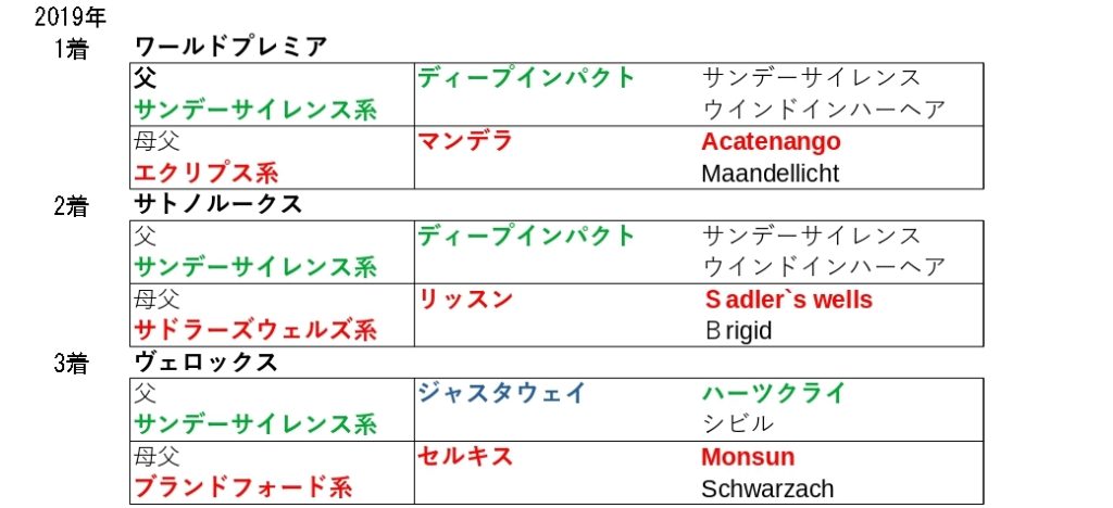 トニービン自身は凱旋門賞を勝っているように欧州型の血統ですし、中盤5Fが緩むとはいえスタミナは必要であり、ラスト5〜4F目のロンスパ戦となるレースなので、持続力の要素を持つこの血統の活躍となっています