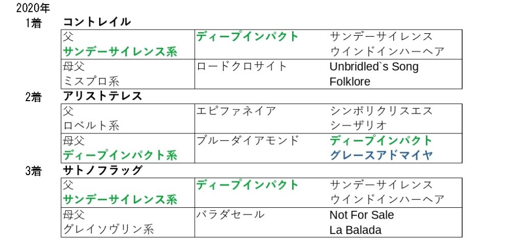 唯一該当していなかったのが、無敗の3冠馬となったコントレイルだったことからも、近年のクラシックのトレンドが、欧州型の血統となっていることも関係していると思います