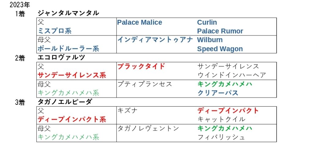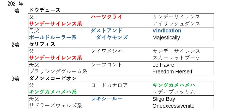 2歳の時期のG1ということで、早期の完成度が問われ、短距離馬も多く参戦するので、スピードの持続力と早熟性を持つこの血統の活躍に繋がっていると思われます