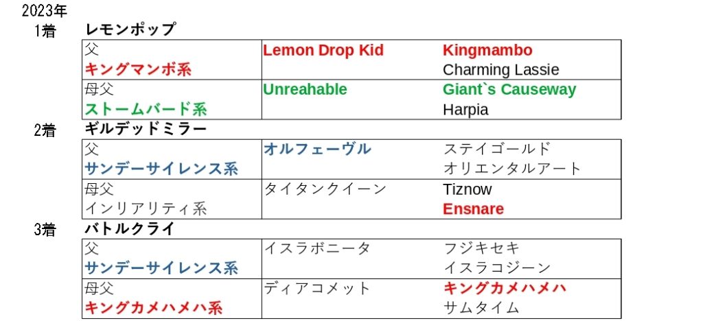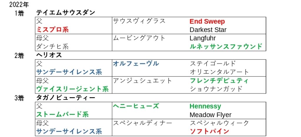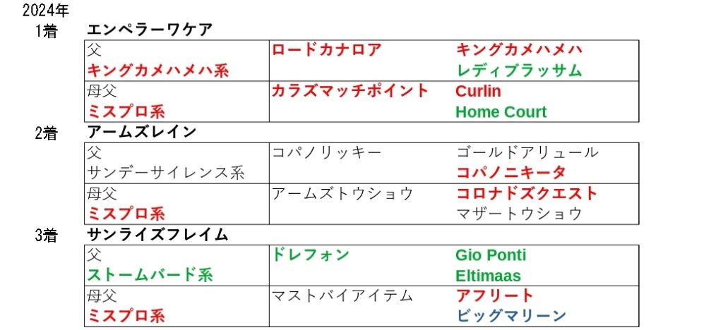 1200Mに適性のある馬の出走も多いため、前傾戦になりやすく直線の長いコースということで、道中の追走スピードと直線でのスピードの持続力を持つこの血統が大活躍しています