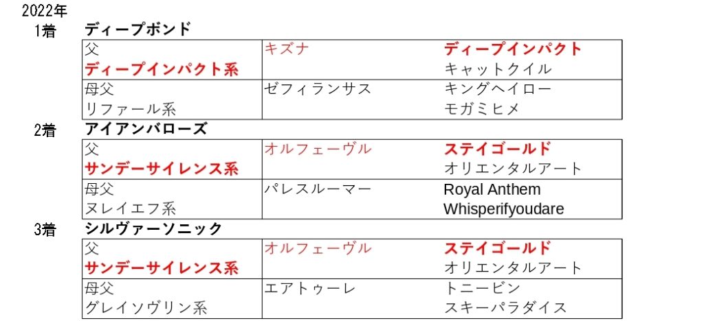 好走馬15頭中14頭が、サンデーサイレンス系の産駒か母父サンデーサイレンス系だったことからも、この血統が中心となっています