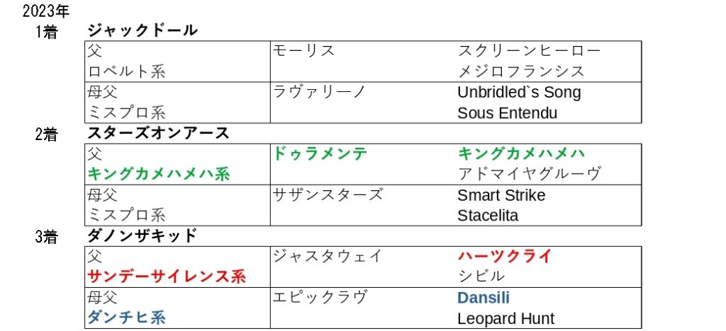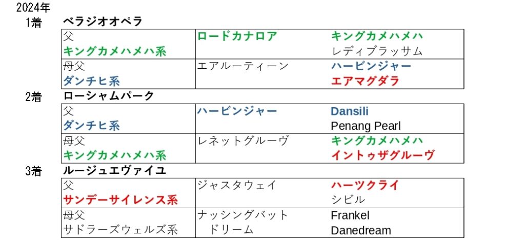 24年、23年の3着馬はハーツクライの系統の産駒でした
