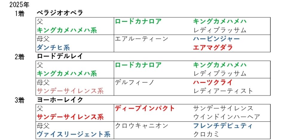 2勝を挙げていて、直近2年こそ産駒の連対はありませんが、25年と24年の好走馬は全てサンデーサイレンス系の血を持っていました