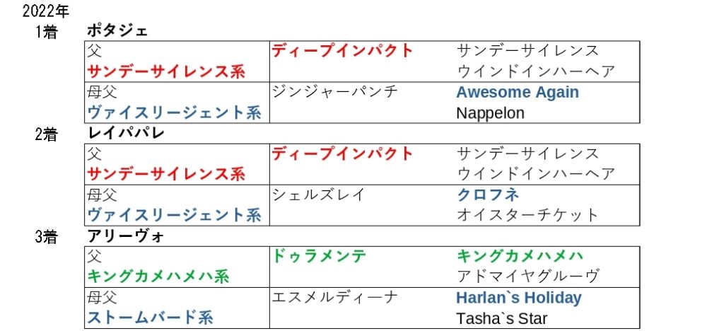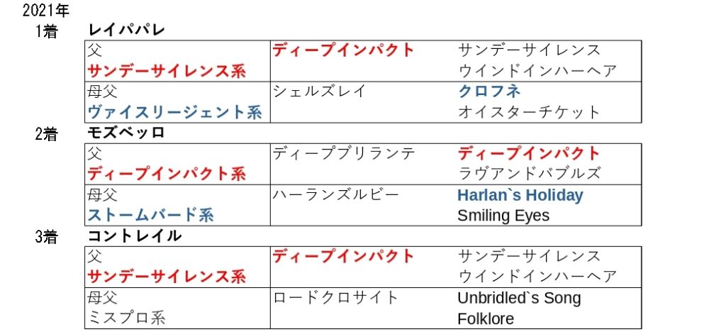 直線の短いコースでの中距離G1なので、道中も極端に緩まず後半の動き出しもラスト6~4Fのロンスパ戦となることから、道中の追走力や後半のスピード持続力が必要なことから、この血統の活躍となっています